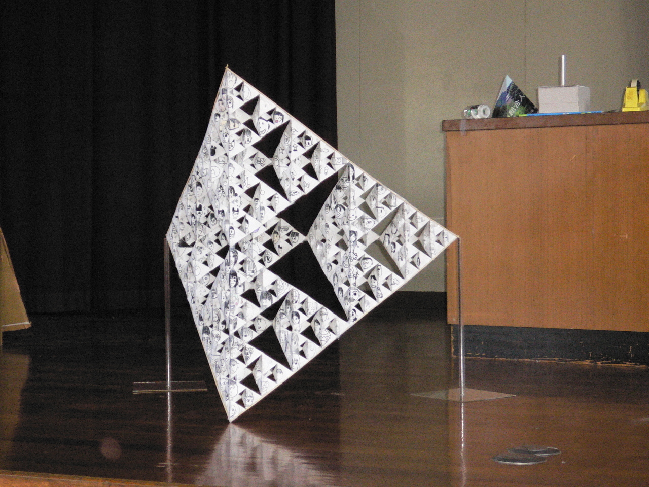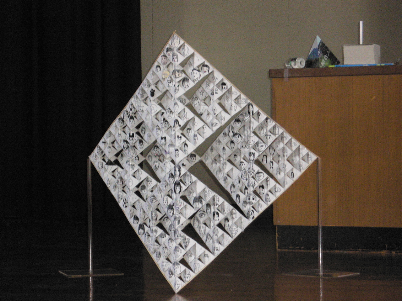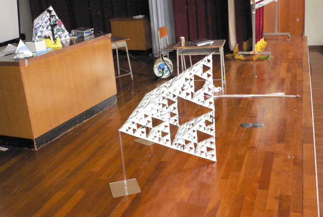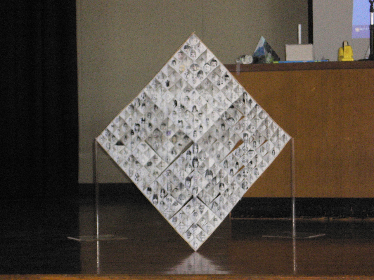 いよいよ、4つの64ピースの穴あき四面体を壇上に集めて、256ピースのものの作成です。これは、全員参加は不可能。各グループの代表者の人に壇上にあがってもらって、作成です。補強のために、竹ひごを回りにつけました。そして、用意してきた台に載せて、完成です。