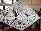 次に、4つのグループが集まって、4ピースの穴あき四面体をくっつけて、16ピースの穴あき四面体を作成します。これは、先ほど4ピースのものを作った時と同じ要領です。16ピースのものができると、みんな大はしゃぎ。新聞社のカメラマンを追っかけて、四面体を手に、グループでピースをしています。これが16個できます。