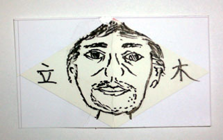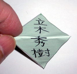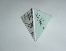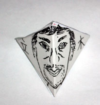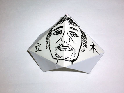 最初の仕事は、この長方形の紙を折って四面体にして、その裏にしーる紙を貼ることです。これで、前面に自分の描いた似顔絵、裏面に名前の入った正四面体が、256個できます。