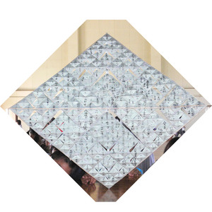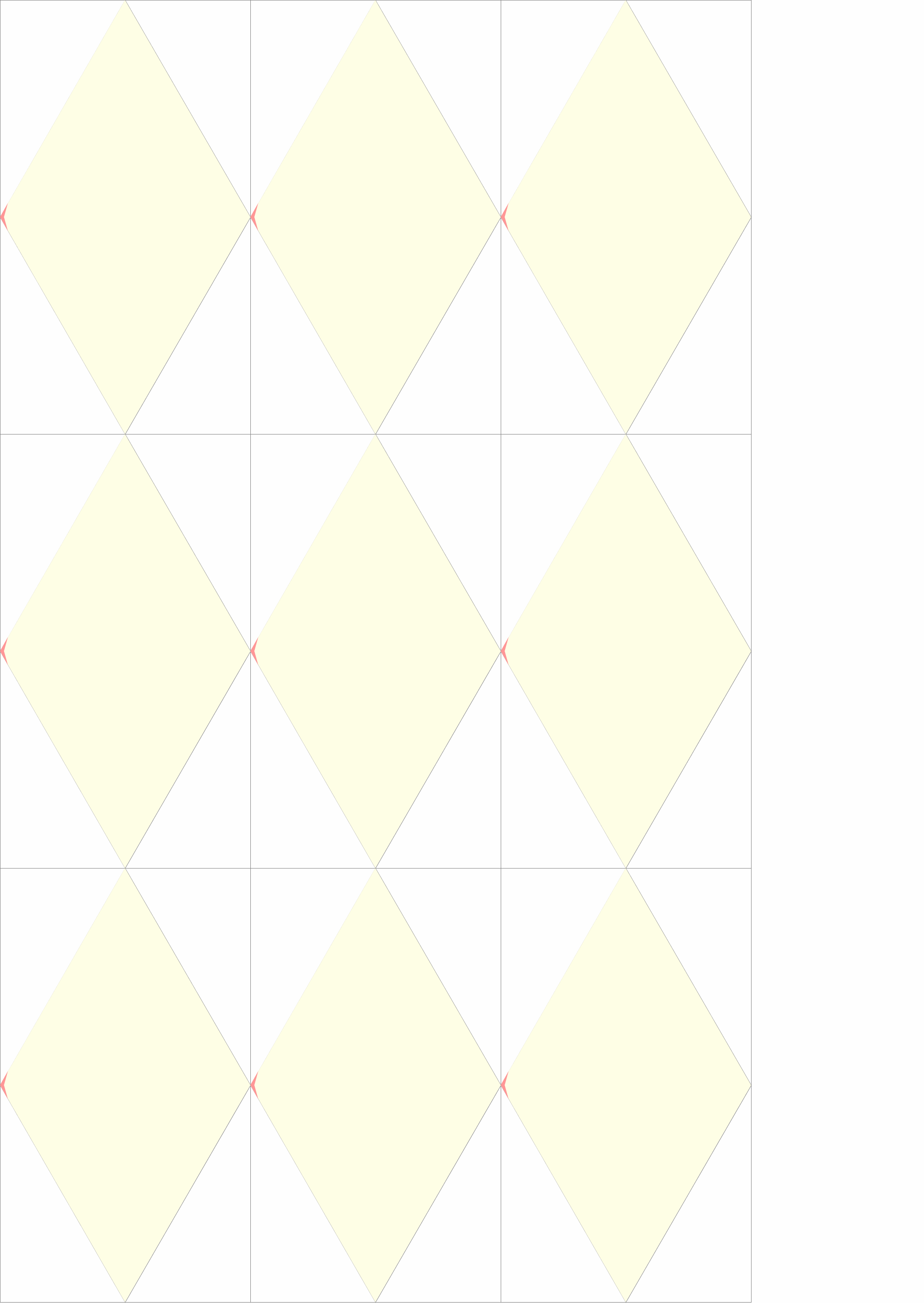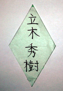 生徒には、事前に、真ん中にひし形に枠のついた長方形の紙と、ひし形のシール紙のセットを配って、長方形の紙のひし形の枠の中に自分の似顔絵を、シール紙の方には各自の名前を描いておいてもらいました。この長方形の縦横とシール紙の2本の対角線は同じ長さで、縦横の長さの比が 1:1.73 (1対ルート3) になっています。3人のグループのところは、もう1セット余分に用意することとし、各グループで4セットづつ、全体で256セット用意しておいてもらいました。