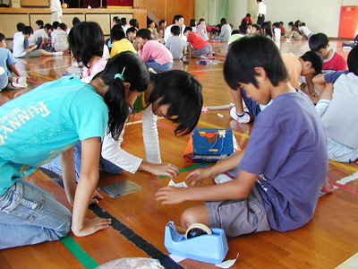 まず、体育館に集まった生徒を相手に、90分ほど立体図形とその影に関する話をしました。長時間、難しい話を聞くのはつらそうでしたが、オブジェの製作だけを楽しむのではなく、この立体を通じて数学的に考えることの面白さを伝えたいというのが私の考えです。この講義で、この立体が正方形に見えるということを納得(?)してもらってから、グループに分かれて、オブジェの製作開始です。