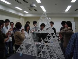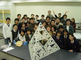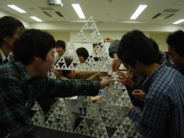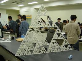 立命館中高等学校のSSS(スーパー サイエンス サタデー) にゲストとしてお招 き頂きました。詳しくは、 Super Science Now の、vol. 26 をご覧下さい。 そして、1024個の正四面体のピースからなるガスケットを作成 しました。あらかじめ、文田先生が折り目まで入った四面体の展開図を枚数分 用意して下さっていたので、約30人で40分ほどでできました。