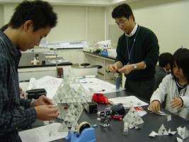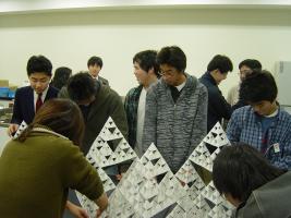 小さな四面体を山のように作る単純作業では、「何のためにこんなことをして いるの」と生徒たちの目が訴えてましたが、4つ、16個、64個と組みあわさって どんどん大きくなって、それが256, 1024 となった時の感激は、その分ひとし おです。
