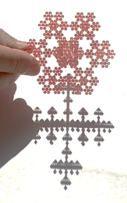 これは,(1,1,1) からの射影像です。 シェルピンスキー四面体は 1 + 1 + 1 が奇数なので面積のある影ができ, H-フラクタルと T-フラクタルは 1+1+1 が3の倍数なので面積 0 の影ができます。