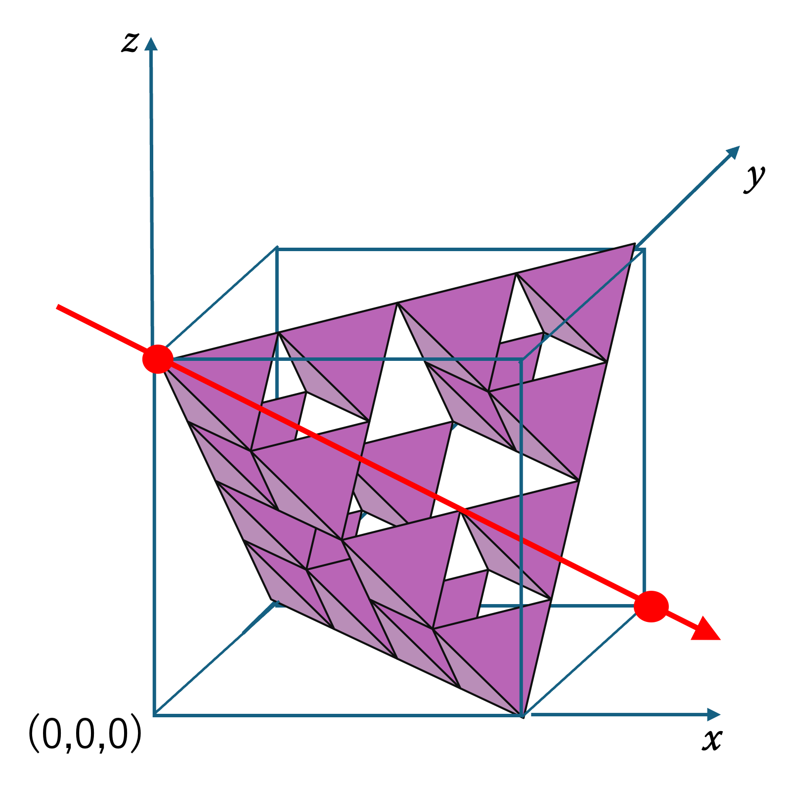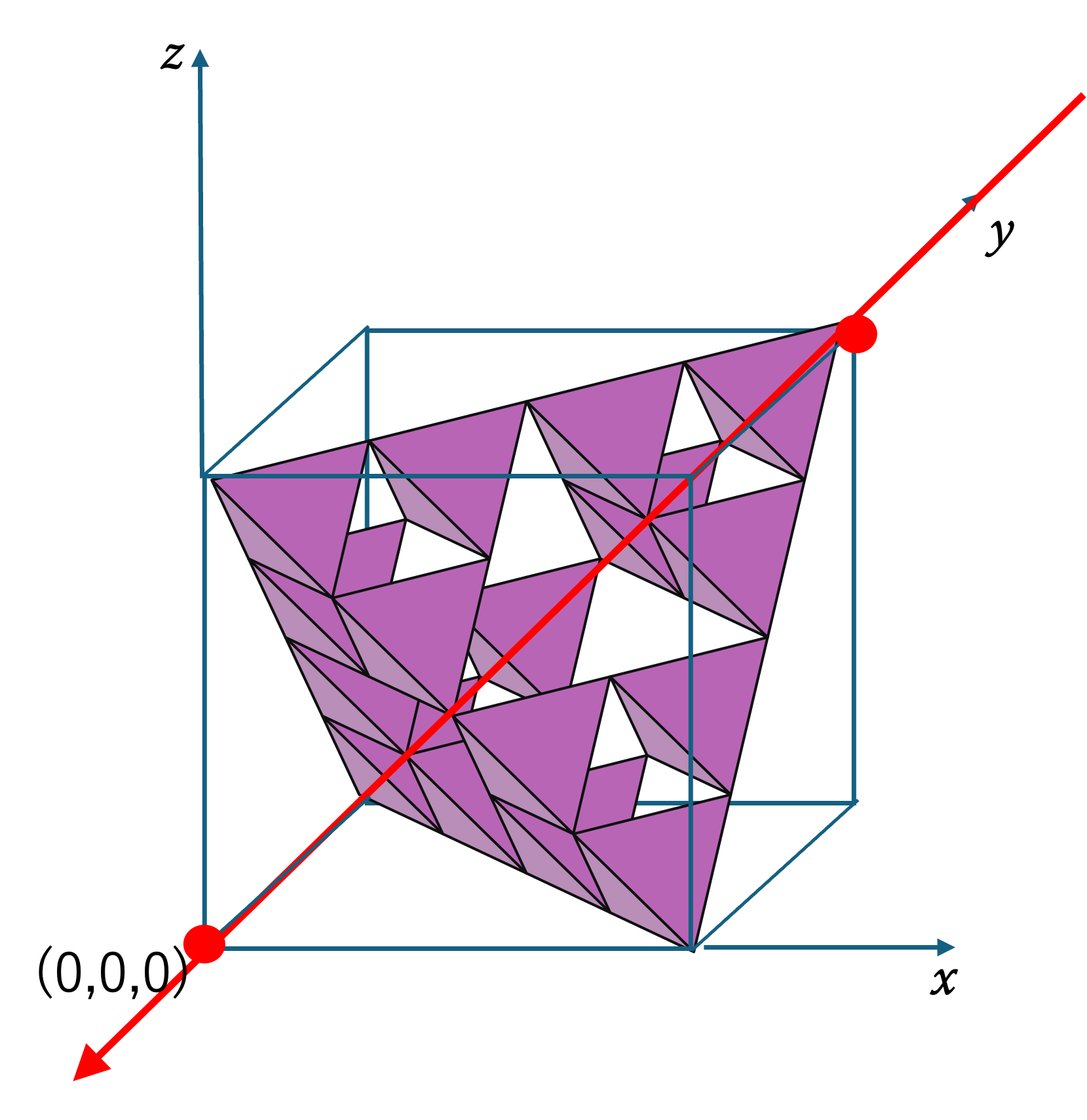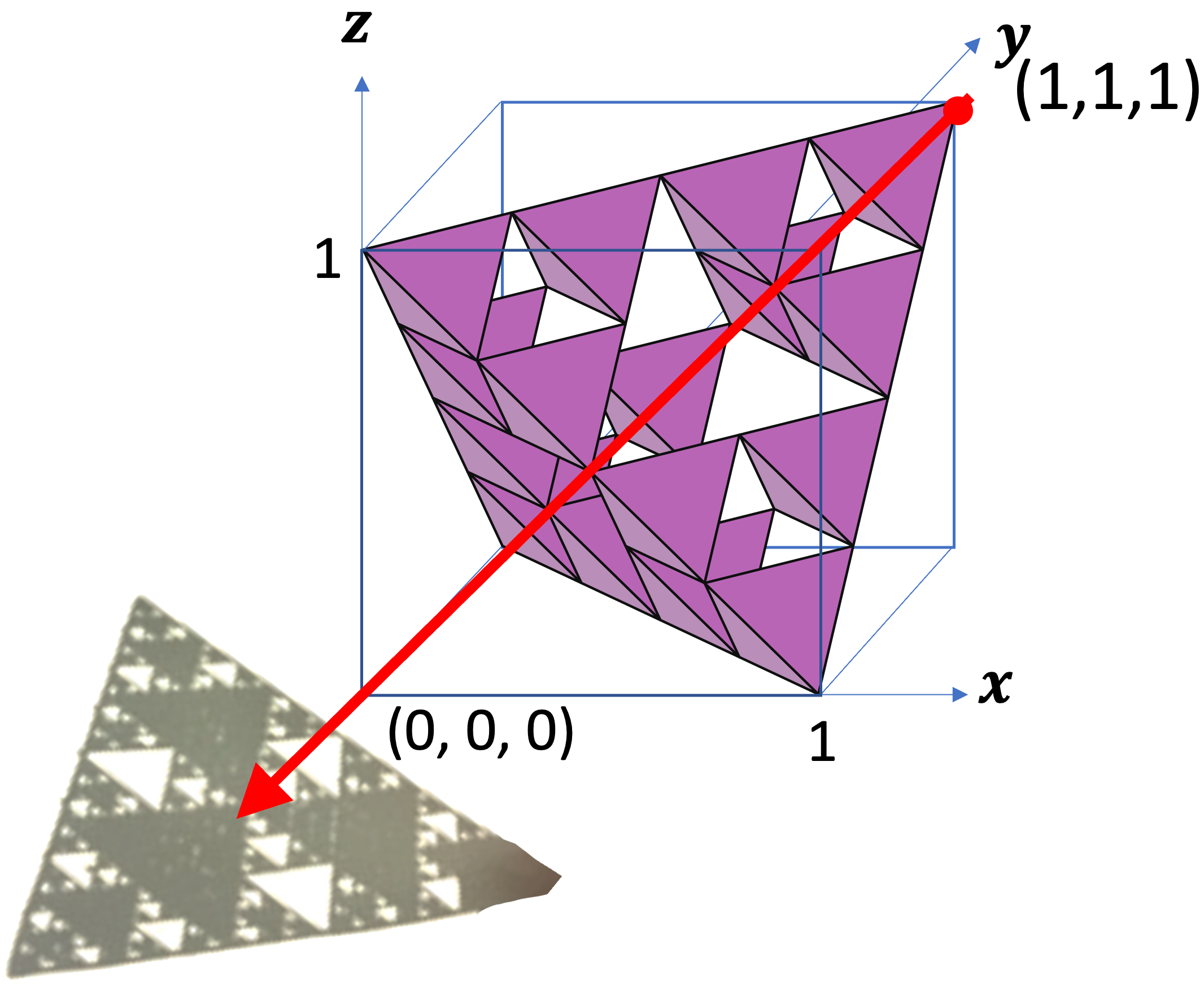 上図のように,これらのフラクタルを辺の長さが 1 の箱に入れた状態で考えましょう。そして,箱の左手前の頂点を原点にして,箱の3辺を x, y, z 軸とし, (a, b, c) という座標から原点に向けて光をあてて影を作っているとします。その時に,次のことが成り立ちます。