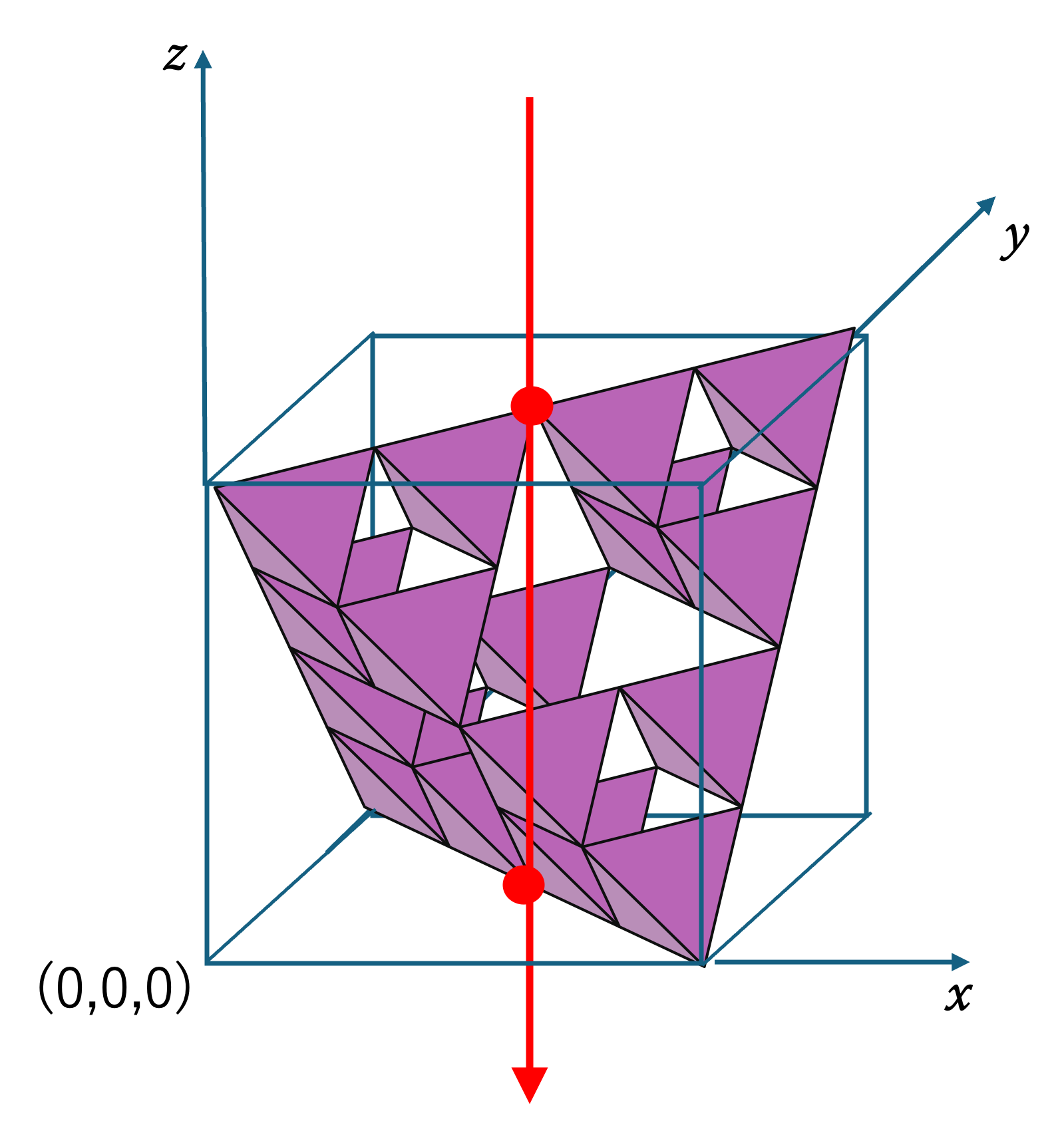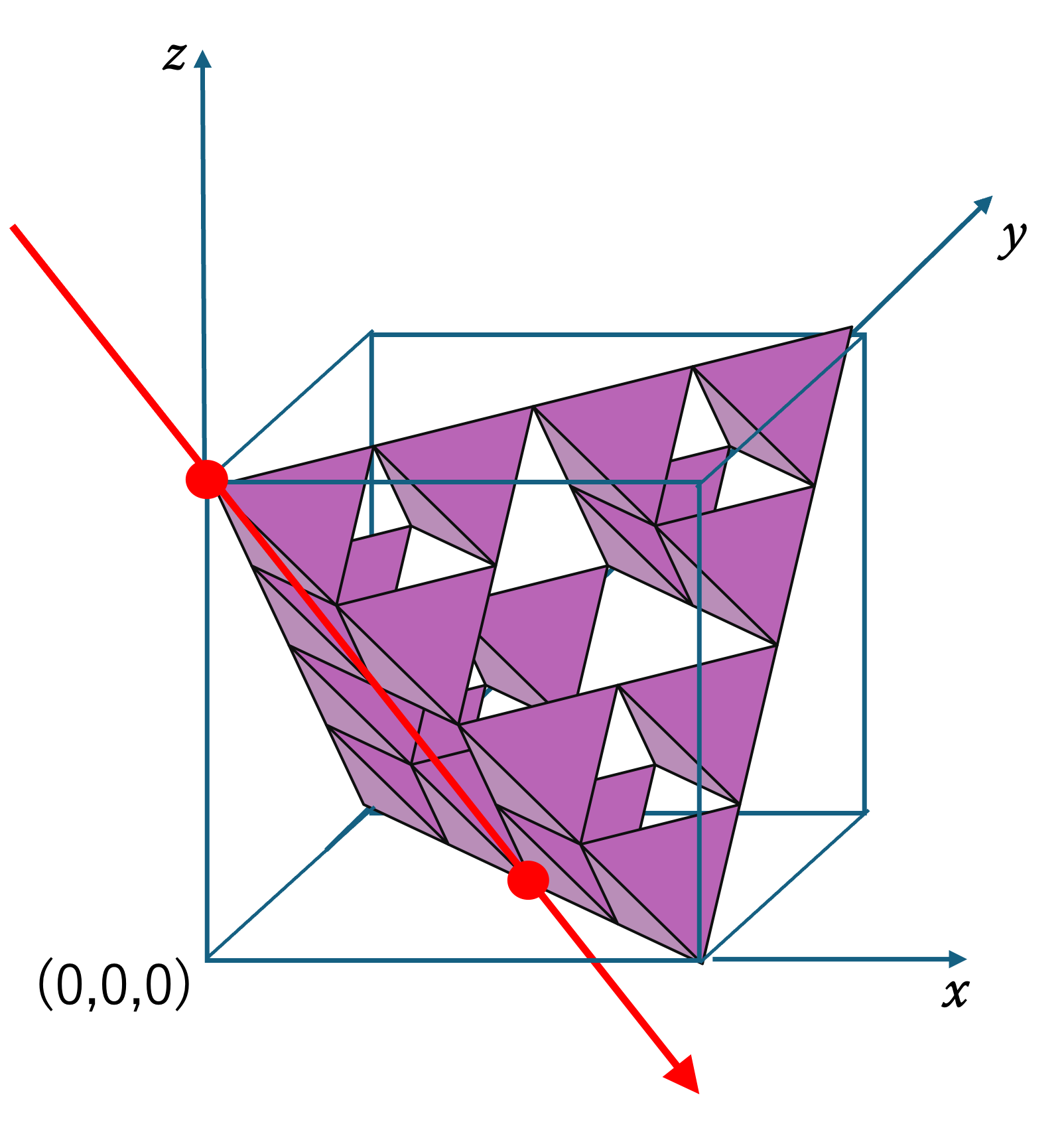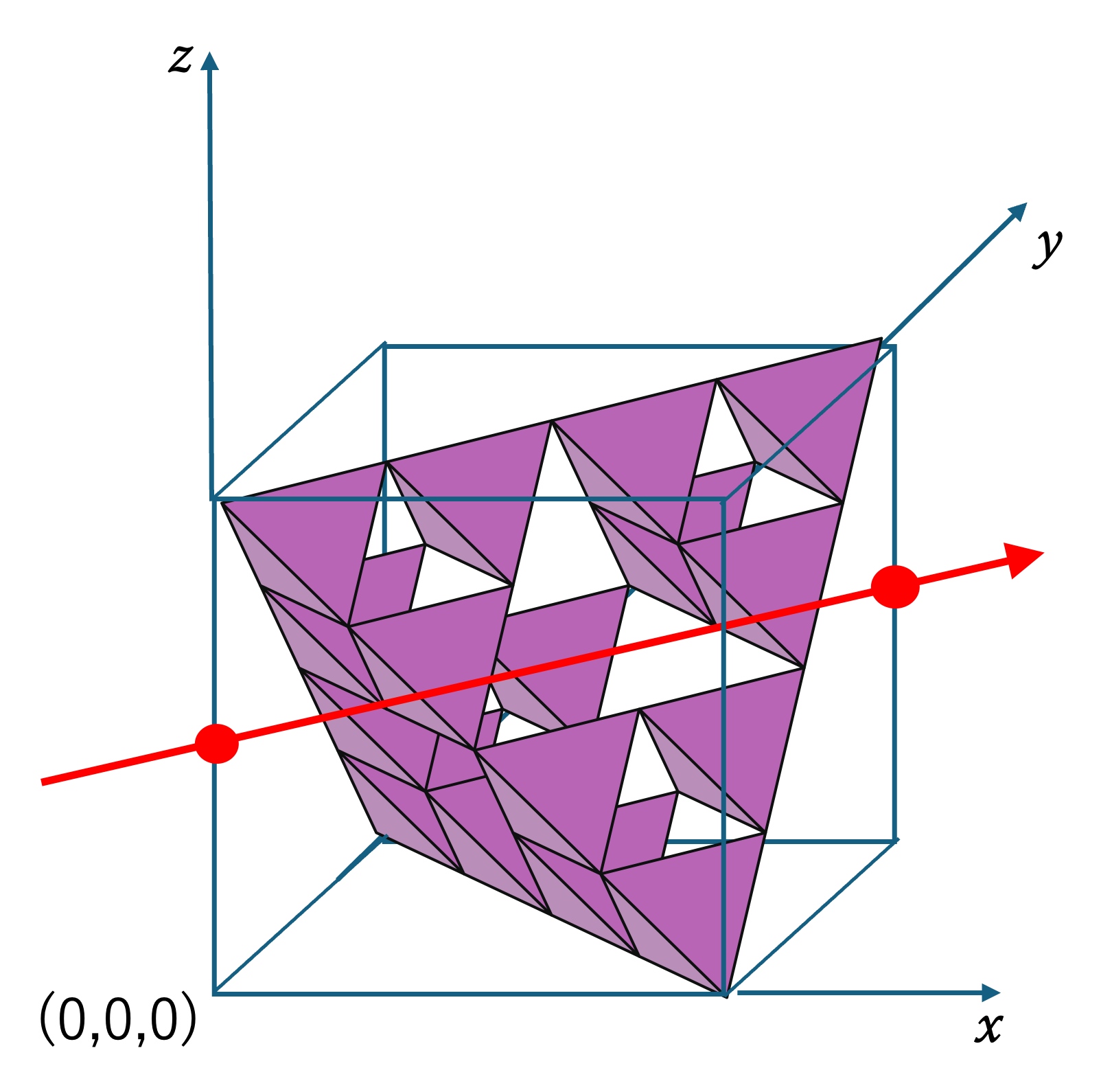 上図のように,これらのフラクタルを辺の長さが 1 の箱に入れた状態で考えましょう。そして,箱の左手前の頂点を原点にして,箱の3辺を x, y, z 軸とし, (a, b, c) という座標から原点に向けて光をあてて影を作っているとします。その時に,次のことが成り立ちます。
