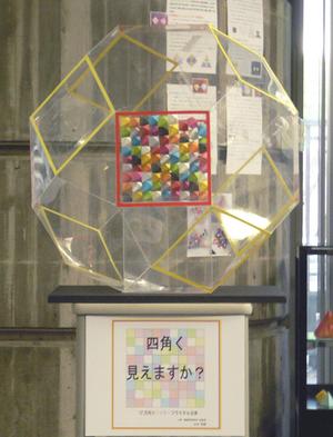 このオブジェを,これらの12個の正方形の面から見ると,隙間がふさがって,四角く 見えます。赤い枠から見ても,黄色い枠から見てもです。
