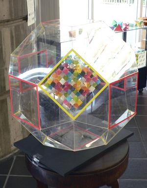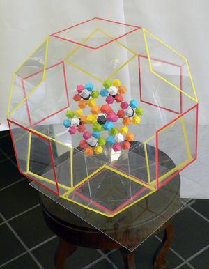 これは,81個の重六角錘からなる, 重六角錘フラクタルの2次近似 です。それが,透明アクリルの32面体の中に入っています。この32面体は, 12個の正方形の面をもっています。そのうち6個は赤く縁取られていて,6 個は黄色く縁取られています。