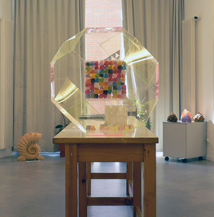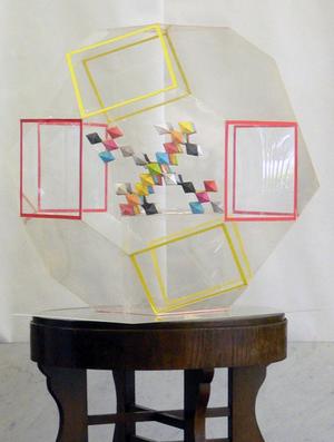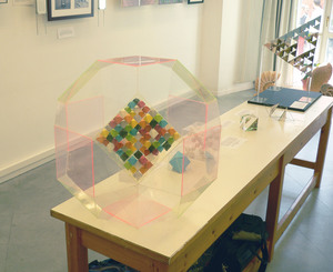 スペインのサンセバスチャンで2007年7月24日から27日まで行われた, Bridges conference (数学と芸術に関する国際会議) にて,展示/発表を行いま した。その時には,フレームのアクリルオブジェクトとして,正方形の面がピ ンクと黄色のアクリルになっているオブジェを作成しました。