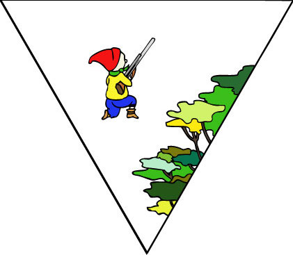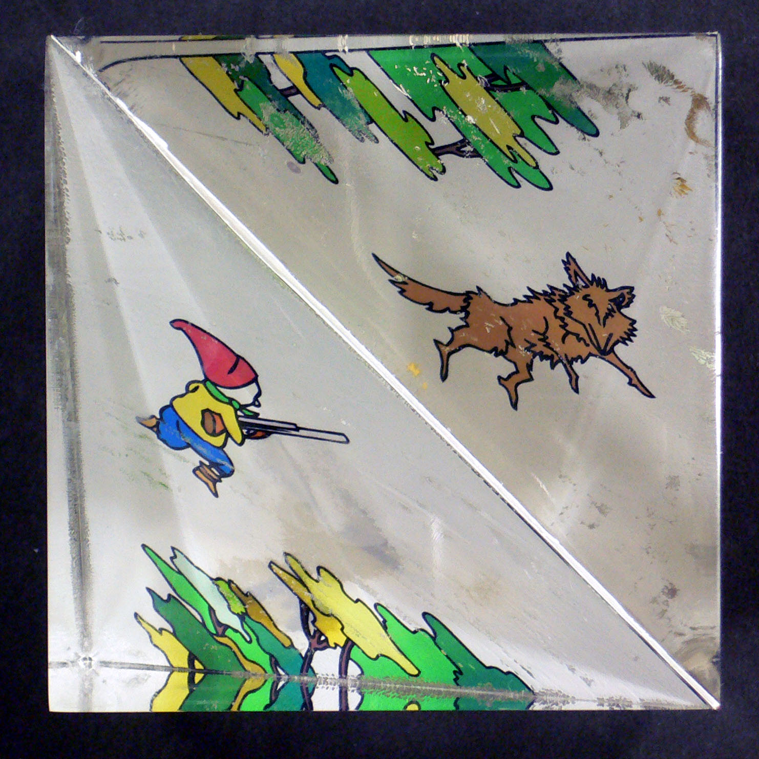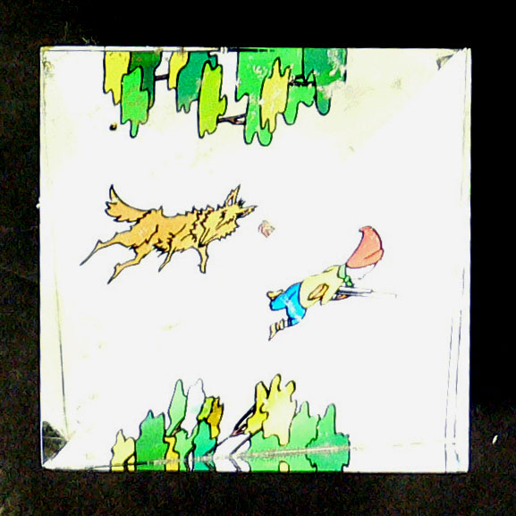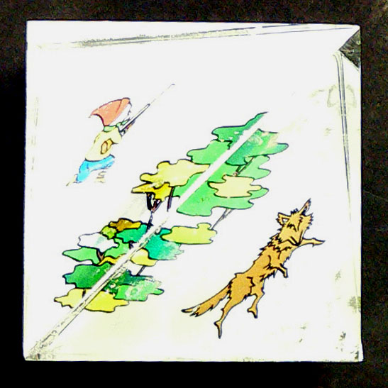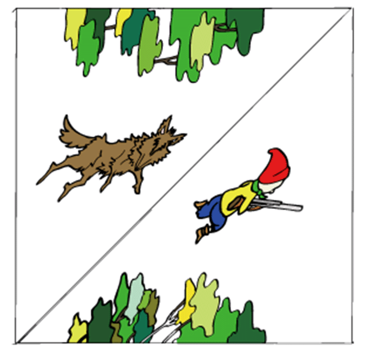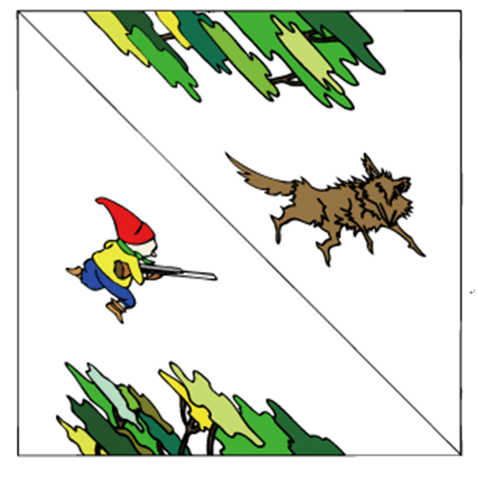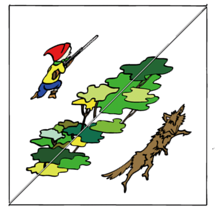 これを、ある方向から見ると、少年が狼をねらっているように見えます。 他の方向から見ると、狼が少年に襲いかかる絵に見えます。 また、もう一つの方向から見ると、少年と狼の間に林があって、お互いに見えなく なります。